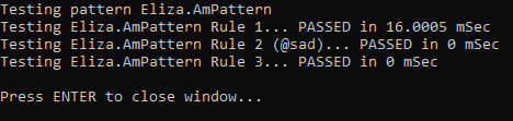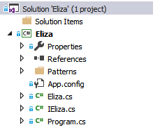 Improving the testing frameworkNow that we have a Test class, we could simply instantiate and run it for every decomposition rule we want to test. But that would cause ElizaTest's Main() method to grow to an unwieldy size. Instead, we'll create a new TestPattern class responsible for testing a specific pattern. TestPattern in turn will create and run instances of Test for every decomposition rule in the pattern. TestPattern will be an abstract class, which will require its pattern specific derived class to construct its Test instances. The first pattern we'll test will be the "AM" pattern, so AmPatternTest will be the first subclass of PatternTest. Test and PatternTest constitute our testing framework. So we'll locate them in a "TestFramework" folder within the ElizaTest project. Pattern specific classes (like AmPatternTest) that derive from PatternTest will be located in the "PatternTests" folder.