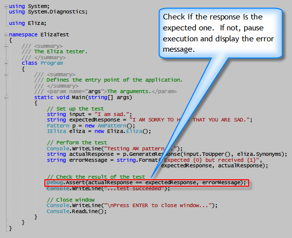 Getting ready to write more testsYou may think that the code we wrote for testing the response to "I am sad." seems like a lot of work, especially since we'd have to repeat this code in order to test every decomposition rule in every pattern. In reality, every test we write is virtually identical. The only difference between each test is the user input passed to GetResponse() and the response we're checking for. To reduce the effort of writing tests, we'll create a helper class Test that will do the actual testing. ElizaTest will then simply use Test to specify what needs to be tested and will call its Test.Run() method to run the test. This will allow us to express our tests in a concise form, as shown below.