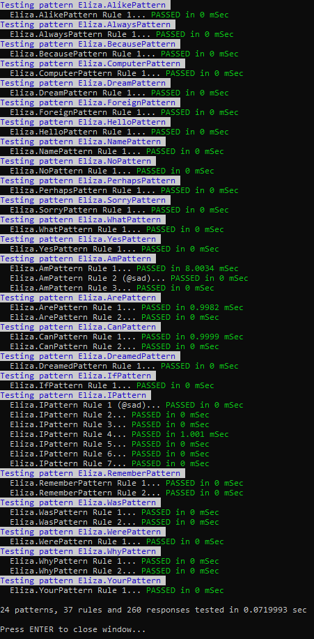 Testable Eliza!Eliza is finally testable! Here's what the ElizaTest project looks like after creating tests for every pattern. Notice that we moved complex and format free pattern tests to separate folders to keep things organized.